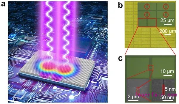 本工作中,基於(yu) 光熱反應機理,研究團隊設計開發了一種新型三層堆疊薄膜結構。在無機鈦膜光刻膠上,采用雙激光束(波長為(wei) 405 nm)交疊技術(見圖2a),通過精確控製能量密度及步長,實現了1/55衍射極限的突破(NA=0.9),達到了最小5 nm的特征線寬。此外,研究團隊還利用這種超分辨的激光直寫(xie) 技術,實現了納米狹縫電極陣列結構的大規模製備(如圖2b-c)。相較而言,采用常規聚焦離子束刻寫(xie) ,製備一個(ge) 納米狹縫電極需要10到20分鍾,而利用本文開發的激光直寫(xie) 技術,可以一小時製備約5×105個(ge) 納米狹縫電極,展示了可用於(yu) 大規模生產(chan) 的潛力。