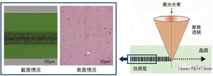 激光隱形切割作為(wei) 激光切割晶圓的一種方案,很好的避免了砂輪劃片存在的問題。如圖1所示,激光隱形切割是通過將脈衝(chong) 激光的單個(ge) 脈衝(chong) 通過光學整形,讓其透過材料表麵在材料內(nei) 部聚焦,在焦點區域能量密度較高,形成多光子吸收非線性吸收效應,使得材料改性形成裂紋。每一個(ge) 激光脈衝(chong) 等距作用,形成等距的損傷(shang) 即可在材料內(nei) 部形成一個(ge) 改質層。在改質層位置材料的分子鍵被破壞,材料的連接變的脆弱而易於(yu) 分開。切割完成後通過拉伸承載膜的方式,將產(chan) 品充分分開,並使得芯片與(yu) 芯片之間產(chan) 生間隙。這樣的加工方式避免了機械的直接接觸和純水的衝(chong) 洗造成的破壞。目前激光隱形切割技術可應用於(yu) 藍寶石/玻璃/矽以及多種化合物半導體(ti) 晶圓。