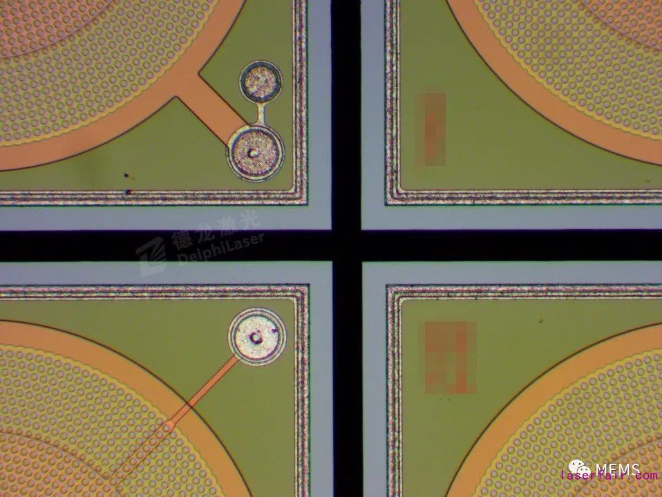 矽材料透射光譜的特性,見圖2,矽材料對紅外透過率很高,所以矽的隱形切割設備,通過選用短脈衝(chong) 紅外激光器,將激光脈衝(chong) 聚焦到矽襯底內(nei) 部,實現隱形切割。激光隱形切割是非接觸式切割,解決(jue) 了砂輪切割引入外力衝(chong) 擊對產(chan) 品破壞的問題。不過一般設備的激光隱形切割形成的改質層區域會(hui) 使材料變得酥脆,還是會(hui) 形成少量細小矽碎屑掉落,雖然碎屑數量遠少於(yu) 砂輪切割,如前文所述,MEMS晶圓因為(wei) 無法通過清洗的方法去除細小矽碎屑,故這些碎屑將對芯片造成破壞,影響良率。德龍激光生產(chan) 的矽晶圓激光切割設備,見圖3,選用自製的紅外激光器和自主開發的激光加工係統,實現矽晶圓的隱形切割,該設備能夠很好的控製隱形切割後碎屑的產(chan) 生,從(cong) 而滿足高品質MEMS晶圓切割的要求,保證切割良率。德龍激光的矽晶圓激光切割設備自推向市場後,得到了國內(nei) 多家量產(chan) 客戶的認可和好評,設備在多個(ge) MEMS製造廠內(nei) 批量切割諸如矽麥克風/電熱堆/陀螺儀(yi) 等MEMS產(chan) 品。實物切割效果圖見圖4。