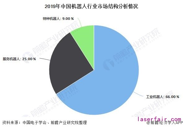 我國機器人根據不同用途可大致分為(wei) 工業(ye) 機器人、服務機器人以及特種機器人三類,其中工業(ye) 機器人為(wei) 當前我國普及度最高的機器人種類,占據最多市場份額。根據中國電子學會(hui) 數據,從(cong) 我國2019年機器人市場結構來看,工業(ye) 機器人占比最高,達到66%;其次為(wei) 服務機器人,占比25%;特種機器人應用程度相對較低,占比僅(jin) 為(wei) 9%,不足10%。