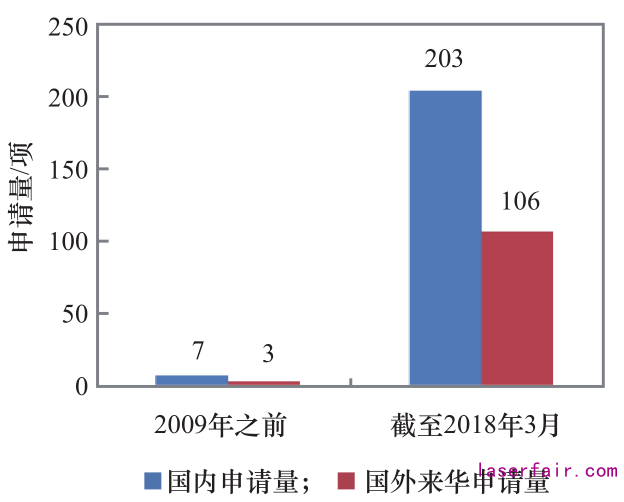 圖 1 準分子激光技術國內(nei) 發明專(zhuan) 利申請量與(yu) 國外來華發明專(zhuan) 利申請量對比圖
