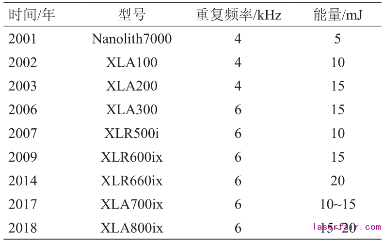 表 1 ASML 公司(Cymer)ArF 準分子激光產(chan) 品的發展曆程