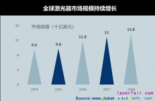 激光產(chan) 業(ye) 鏈中遊為(wei) 激光器,包括光纖激光器、二氧化碳激光器、其他固體(ti) 激光器等。激光器作為(wei) 所有激光應用產(chan) 品的核心部件,是所有激光應用產(chan) 品的重中之重,下遊設備市場規模的高速增長也帶動激光器市場需求不斷上升。2018年fun88官网平台器市場規模達11.8億(yi) 美元,占全球市場份額的60.6%。