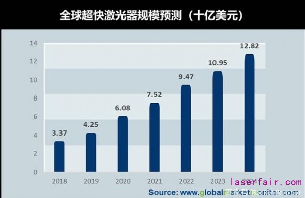 中國市場方麵,激光技術在消費電子、新型顯示、激光內(nei) 雕、生物醫療等領域獲得了越來越多的應用,國內(nei) 傳(chuan) 統製造業(ye) 正麵臨(lin) 深度轉型和升級,超快激光市場在近幾年也取得了較大發展,2018年超快激光市場規模達到11.74億(yi) 元,增速達到45.06%,是整個(ge) 激光設備市場增長速度的兩(liang) 倍。