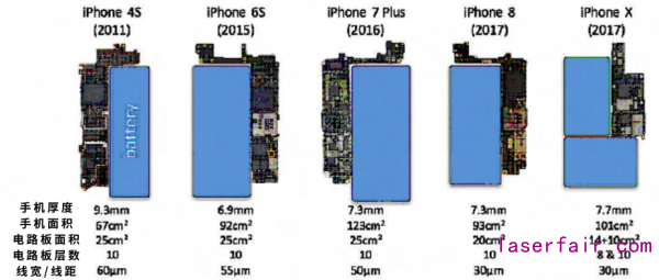 許多IC模組采用陣列布局,需要關(guan) 注的是其引腳數量,同時包括焊盤尺寸及間距。更複雜的芯片無疑會(hui) 較之前有更多的輸入輸出(I/O)引腳 。為(wei) 推動芯片封裝尺寸的小型化,則需從(cong) 減少焊盤尺寸和間距入手,與(yu) 之對應的則是需要更多的繞線形成相互連接。最新的移動智能終端設計已經需要用到線寬/間距30 μm/30 μm的線路了,且有進一步減小的趨勢。對於(yu) 線路尺寸減小的驅動力可以追溯到2016年,當時發布了采用台積電先進的扇出型封裝(InFO)處理器芯片的iphoness-7係列手機。典型的手機結構設計演進過程如圖1所示。