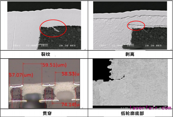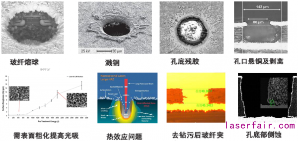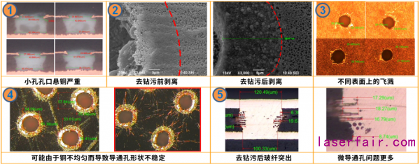 帶銅箔半加成法工藝的關(guan) 鍵就是使用了載體(ti) 銅,這有助於(yu) 銅箔的抗剝離強度穩定且加強纖維的支撐;但會(hui) 損失一部分更細線路加工的能力,同時也會(hui) 造成激光直接加工的負麵影響。典型的光亮薄銅麵激光直接加工問題,可參考圖8所示。未來高頻板的銅結合麵也將是低棱線狀態,屆時CO2激光加工吸收率偏低會(hui) 導致殘足問題的產(chan) 生。圖8 低棱線銅箔材料加工銅箔分離、孔角開裂、測蝕等問題盡管新型激光已經到來,但現有的CO2激光還會(hui) 維持一段時間的主流地位。為(wei) 了配合帶銅箔半加成法工藝,可通過銅麵前處理來提升CO2激光的吸收率,並可改善孔型;但當載體(ti) 銅厚度低於(yu) 3 μm,如何進行氧化層清除,維持後續除膠、電鍍等處理的穩定性都將麵臨(lin) 挑戰。特殊情況下,生產(chan) 企業(ye) 根本沒有空間做氧化處理,而是挑戰在亮麵銅上做微孔加工。