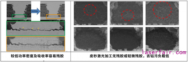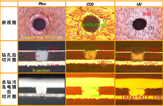 除了封裝技術,PCB生產(chan) 技術也發生了較大的變化。目前微孔加工主要還是采用CO2激光,但其存在明顯的缺陷,就是在加工每一個(ge) 孔的過程中產(chan) 生明顯的熱影響區域,這種情況直接影響微孔的最小間距、孔徑/孔型能力及品質。典型CO2激光加工存在的挑戰如圖2所示。圖2 CO2激光加工缺陷不利於(yu) 微小孔及未來材料加工需求為(wei) 解決(jue) CO2激光的熱效應問題,激光器製造商著手研發新型超短脈衝(chong) 激光,嚐試替代現有的納秒脈衝(chong) 係統。理論上,典型的激光光學係統特性如圖3所示。圖3 高峰值功率、加工時間短、更好的材料兼容性等優(you) 點有利於(yu) 微小尺寸及窄邊距孔的加工新型的激光不但有利於(yu) 微孔加工,也將熱效應區域降低了很多,因此可以加工更小間距的孔,且在高頻材料加工時改善光的吸收率,最終可以獲得更好的微孔質量,降低表麵爆漿、毛邊的問題;在麵對微孔、薄銅結構加工時,微孔的懸銅、銅皮剝離、樹脂裂開、孔底側(ce) 蝕的問題將不複存在。當新型激光正式進入商用階段,HDI板的微孔製作密度和能力將又一次突破。CO2激光加工小孔的一些問題細節,如圖4所示。除了微孔進一步減小麵臨(lin) 的激光加工問題以外,孔金屬化的除膠渣可能成為(wei) 孔互聯可靠性的隱患。依據實際生產(chan) 經驗,超短脈衝(chong) 激光加工的殘膠非常低,且所需的除膠渣負荷也更低,因此更有利於(yu) 填孔電鍍;另外低熱影響區的優(you) 點,對小孔間距能力的提升有非常大的改善作用。如圖5所示為(wei) 高頻材料激光孔結果的對比。所有這些優(you) 點,不但可以以全堆疊孔形成任意層互聯而節約空間,也能夠改善散熱與(yu) 電性的管理,這對於(yu) 最終的組裝和產(chan) 品性能一樣大有裨益。