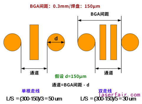 從(cong) 典型的BGA線路設計可以看到焊盤尺寸和線路的線寬/間距是相互影響的,是由焊盤間所需要布局的線路數決(jue) 定的。對於(yu) 低引腳數的封裝,可能僅(jin) 需要在焊盤間通過一條線,如果BGA焊盤節距為(wei) 300 μm,搭配直徑150 μm尺寸的焊盤,則線寬/間距的需求為(wei) 50/50 μm;而對於(yu) 高引腳數的封裝,則焊盤間需要通過兩(liang) 條線路,對應的線寬/間距要求則縮減至30/30 μm。如果繼續縮小BGA焊盤節距,對於(yu) 線路寬度的限製會(hui) 進一步提升。焊盤與(yu) 線路外形的關(guan) 係,如圖6所示。圖6 焊盤節距與(yu) 線寬/間距關(guan) 係新型激光係統可加工更小的孔,則實現更小的孔壁間距,這樣一來可有效縮小BGA的焊盤尺寸,從(cong) 而匹配高引腳數封裝芯片的需求,同時利於(yu) HDI板尺寸的縮減和繞線能力的改善。