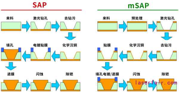 高階HDI板的線路需求從(cong) 40 μm推進到30 μm,且縮減的趨勢延續,必須切換到半加成法工藝才能實現。半加成法工藝在IC載板領域被普遍采用,而在HDI板上使用後,其對應的產(chan) 品則為(wei) 類載板(SLP)。IC載板運用的半加成法(SAP)與(yu) 類載板的帶銅箔半加成法(mSAP)的差異在於(yu) 加工的板材是否是預壓超薄銅箔。目前市場通常情況下,成熟的SAP工藝加工的都是ABF薄膜材料,采用全板沉銅工藝,這並不適合現存多數生產(chan) 設備的設置;因此就催生了改良型方案,即帶超銅箔的半加成工藝技術。兩(liang) 種工藝的具體(ti) 比較如圖7所示。