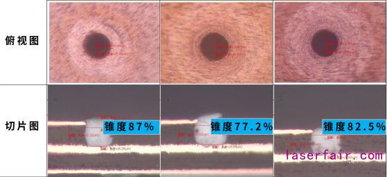 激光加工新的解決(jue) 方案,其挑戰主要聚焦在五個(ge) 方麵:孔徑、孔形、損傷(shang) 、殘膠和成本。有時候對於(yu) 新舊方案成本的比較存在不公平和不合理因素,比如老技術有時根本沒有應對新需求的能力;但是從(cong) 設備使用者的角度來看,新技術的引進都是基於(yu) 比老技術要更好或者相當的評估策略。因此部分設備製造商發出不平之鳴,但無論怎樣都還是以遵從(cong) 買(mai) 方的原則來處理。高能量密度和短脈衝(chong) 可降低熱影響區域,並具有更高的加工性能,但高能量密度可能會(hui) 損傷(shang) 激光光學組件,因此這對微孔加工第一階段的研究製造了一些限製,故先設定目標孔孔為(wei) 30 μm-50 μm。研究團隊采用25 μm-30 μm厚度的介電材料進行試驗加工,所得結果如圖9所示。試驗中測試了CO2、UV、皮秒綠光、皮秒UV等多種可取得的激光,之後因為(wei) 第一階段確認皮秒綠光可用衝(chong) 孔模式作業(ye) 而直接排除了皮秒UV作為(wei) 研究對象,最後得到三組結果。接著調整了介電材料的厚度,再次進行試驗,結果顯示,孔的厚徑比對於(yu) 皮秒加工的表現有明顯影響,特別是在孔徑為(wei) 30 μm的微小孔,測試結果如圖10所示。對此分析原因是源自於(yu) 小孔聚焦景深淺,造成介電層的厚度對極微小孔的影響變得明顯。圖10 厚度15-20μm介電材料不同激光加工對比研究團隊對皮秒激光的孔密度加工能力產(chan) 生好奇,畢竟CO2激光由於(yu) 其嚴(yan) 重的熱效應,加工過程中很難做到維持孔壁損傷(shang) 不嚴(yan) 重;為(wei) 此設計了數組圖形進行測試,發現皮秒激光加工熱效應影響較低,可以在超高孔密度下進行加工,且沒有任何材料損傷(shang) ,這種特性可以延伸到提升散熱效能的應用。其結果如圖11所示。通過以上實驗結果可以證實,皮秒激光加工可以實現微小孔、零懸垂、高孔密度、無殘膠、無噴濺、亮麵銅加工、無剝離、低粗糙度處理無側(ce) 蝕等特性。不過天下沒有免費的午餐,如何提升效率、擴大微孔的可加工範圍仍是我們(men) 期待解決(jue) 的方向。