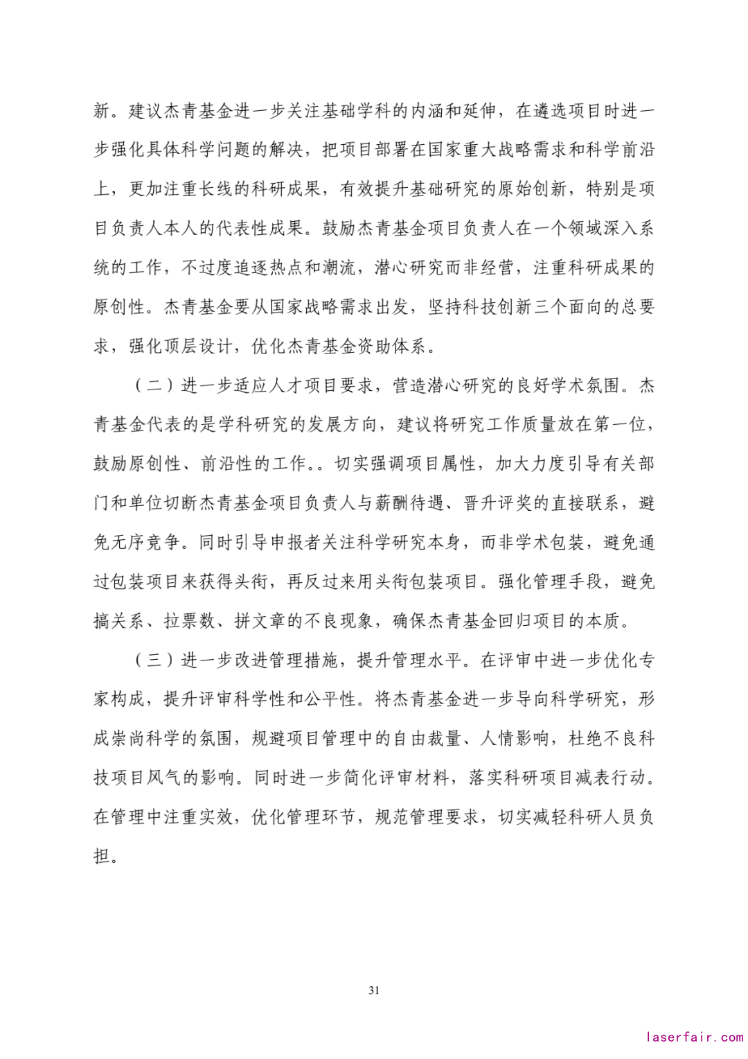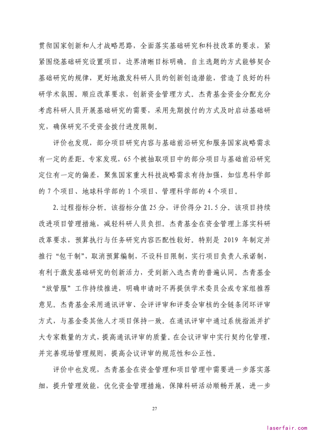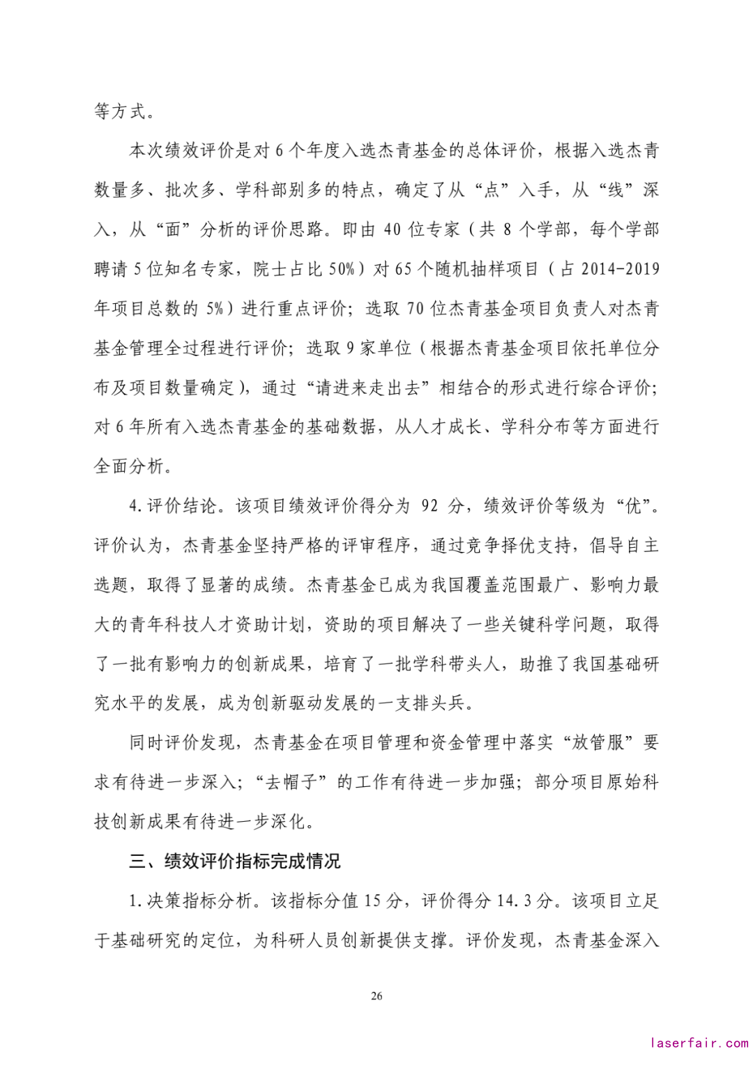 7月21日,國家自然科學基金委員會(hui) 在其網站發布2019年度部門決(jue) 算,其中包括《國家傑出青年科學基金績效評價(jia) 報告》。 該報告為(wei) 財政部預算評審中心組織專(zhuan) 家和第三方機構成立績效評價(jia) 工作組,對國家自然科學基金委員會(hui) 2014-2019年國家傑出青年科學基金項目開展的績效評價(jia) 。 報告顯示: ▲ 傑青基金2014-2019年度共計投入504840萬(wan) 元,資助1287個(ge) 項目; ▲ 2014-2019年,共有113位傑青基金項目負責人當選中國科學院院士(不含外籍院士),占當選院士總人數的60.75%;共有53位傑青基金項目負責人當選中國工程院院士(不含外籍院士),占當選院士總人數的25%; ▲ 美國國家科學院/工程院現有70歲(含)以下中國大陸地區外籍院士17人,其中16人獲得傑青基金資助; ▲ 基金委在扭轉傑青“帽子化”方麵做了一定的工作,但仍然存在“重成績(論文、獎勵)輕研究”的現象,導致一些單位和人過度關(guan) 注傑青基金的稱號而非科學研究; ▲ 引導申報者關(guan) 注科學研究本身,而非學術包裝,避免通過包裝項目來獲得頭銜,再反過來用頭銜包裝項目。 ▲ 強化管理手段,避免搞關(guan) 係、拉票數、拚文章的不良現象,確保傑青基金回歸項目的本質。 以下為(wei) 報告全文: