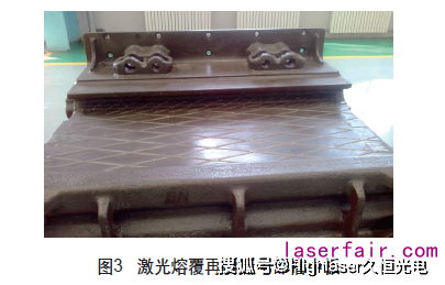 激光熔覆再製造技術在應用進程中一直追求高加工效率,目前已經形成了大功率激光熔覆和超高速激光熔覆兩(liang) 種加工模式,其中大功率激光熔覆又稱傳(chuan) 統熔覆,多采用矩形大光斑、大功率激光為(wei) 熱源,熔覆單道較寬,熔覆層厚度高達2.5mm,可在平麵、弧麵、立麵高效率製得大厚度、大麵積塗層,是目前激光加工的主要技術手段,筆者公司進行了鋼廠軋輥再製造,在其表麵通過激光熔覆鐵基合金粉末實現再製造,替代了傳(chuan) 統堆焊Ni60,創造了經濟收入;采用激光熔覆替代傳(chuan) 統堆焊技術進行板材表麵熔覆,實現了中部槽中、底板的再製造強化,如圖3所示。