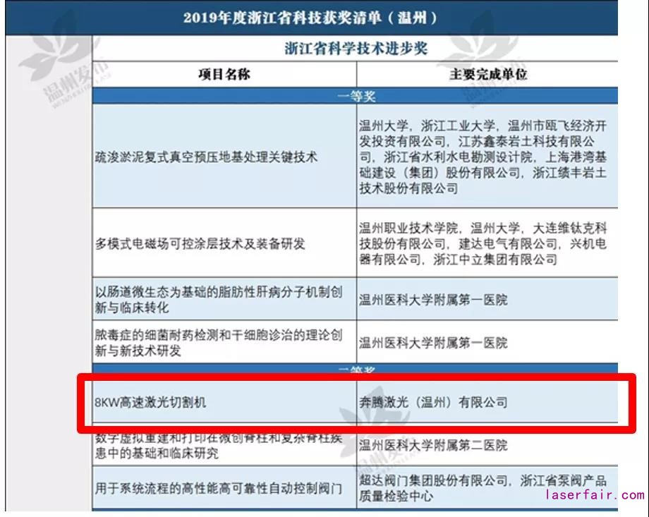 7月17日上午,浙江省科學技術獎勵大會(hui) 在省人民大會(hui) 堂舉(ju) 行,297項科技創新成果榮獲2019年度浙江省科學技術獎。奔騰激光8KW高速激光切割機獲得省科技進步二等獎。