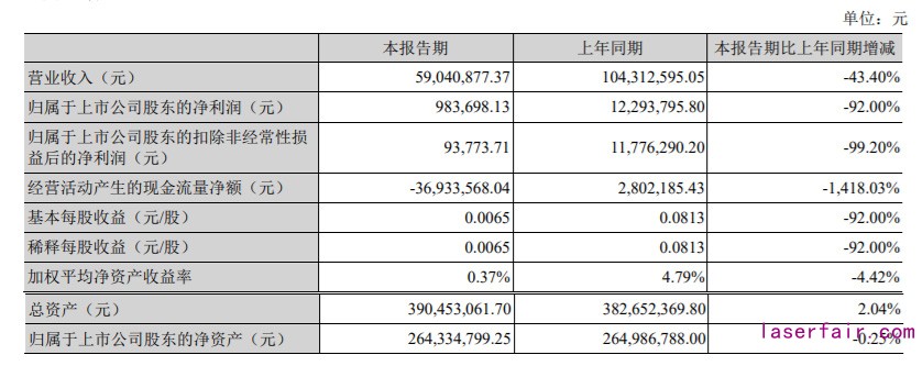 7月28日,金運激光披露的半年報顯示,公司實現營業(ye) 收入5904.09萬(wan) 元,同比下降43.40%,其中固體(ti) 激光係列產(chan) 品銷售收入同比下降54.38%,銷售費用同比下降38.85%;歸屬於(yu) 上市公司股東(dong) 的淨利潤98.37萬(wan) 元,同比下降92.00%;歸屬於(yu) 上市公司股東(dong) 的扣除非經常性損益後的淨利潤9.38萬(wan) 元,同比下降99.20%;基本每股收益0.0065元。