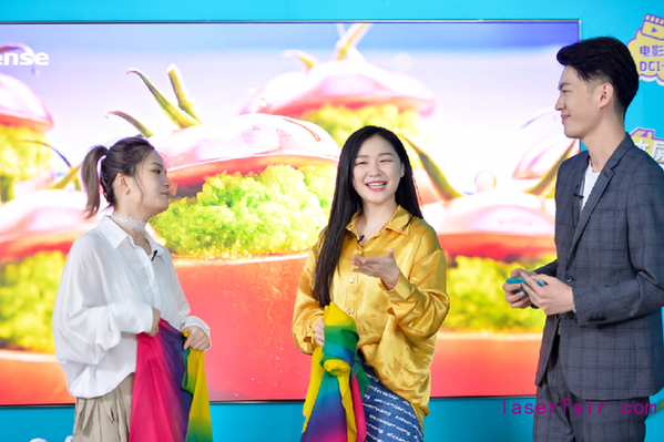 直播中,金靖和劉勝瑛在這台最新款的100英寸海信全色激光電視和8k ULED電視麵前唱歌跳舞,體(ti) 驗海信電視獨有的AI智能應用。