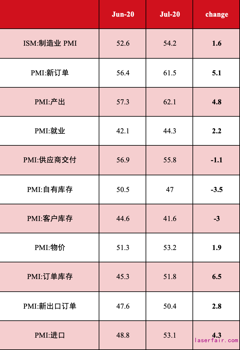 美國7月ISM製造業(ye) PMI錄得54.2,高於(yu) 前值和預期,在連續擴張2個(ge) 月的同時,創下了2019年3月以來的最高水平。
