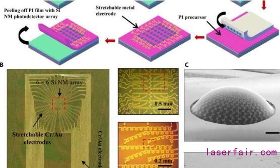 為(wei) 了證明應變誘導的調諧及其對光敏技術的影響,Katiyar等人。記錄字母“ Y”的光電流圖形,該圖形首先以蔭罩的形式製造在玻璃基板上。在達到約1.8%的應變水平後,他們(men) 記錄了可觀的光電流,以在1310 nm SWIR光下清晰地成像“ Y”。隨著凸出測試腔中的應變壓力增加,每個(ge) 光電二極管像素中的應變也增加,最終增加了光電流的進程,以最大3.5%的應變實現圖像。使用壓力誘導的鼓脹方法,研究小組獲得了Si-NM PD像素陣列的凸半球結構,該結構也受到昆蟲的複眼生物啟發而用於(yu) 廣角光檢測。