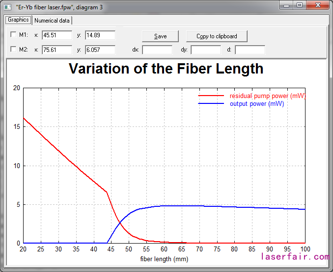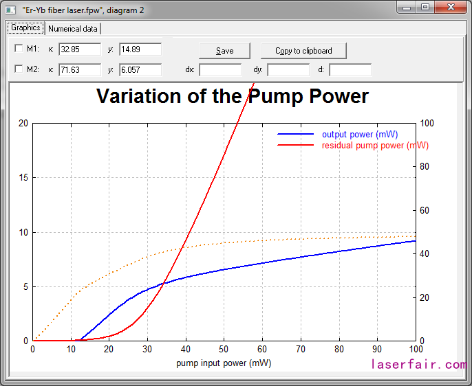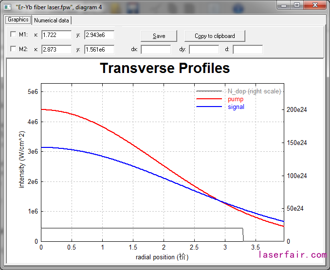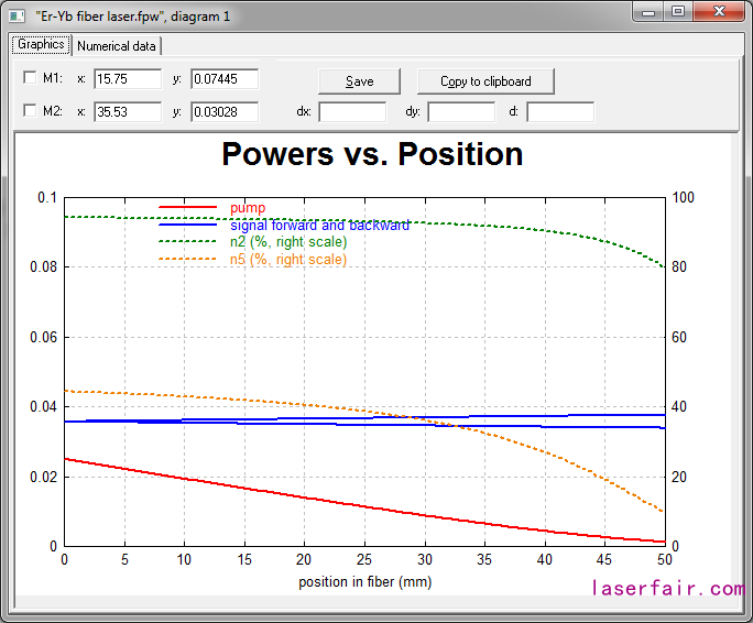 該模型為(wei) 短腔鉺釔共摻光纖激光器,975nm泵浦光束激發鉺離子與(yu) 釔離子。鉺離子的激活能量轉移至鉺離子。此類激光器也可在無釔離子情況下運行,可通過設置釔離子的濃度為(wei) 0...