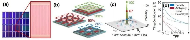 SOPA瓦片陣列形式的光束操縱。(a)完成製造的SOPA瓦片陣列的圖像。(b)不同瓦片填充係數(TFF)的SOPA瓦片陣列示意圖。(c)不同TFF值的SOPA瓦片陣列產(chan) 生的輻射圖型(放大20倍)。(d)用於(yu) 直接檢測和外差檢測時,TFF值與(yu) 信噪比的關(guan) 係圖。