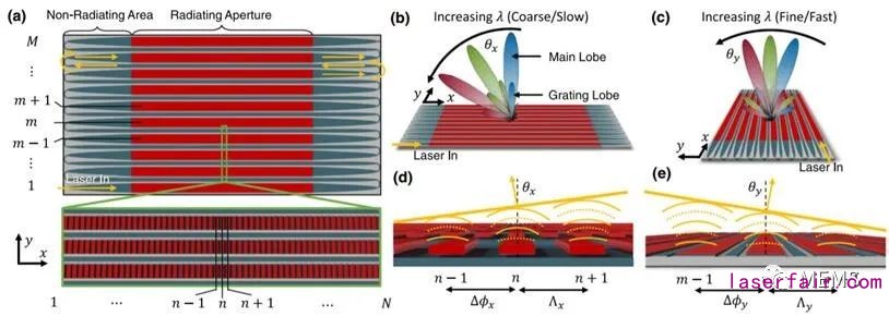 操縱2D波長的單個(ge) SOPA瓦片示意圖。(a)單個(ge) SOPA瓦片拓撲示意圖;M行光柵波導陣列(紅色)呈蛇形排布,與(yu) 反激(藍色)串行連接。每行有N個(ge) 光柵周期。(b)對光束的粗略(慢)操縱。(c)對光束的精細(快)操縱。(d)沿θx的粗略操縱,每個(ge) 光柵波導將光衍射到與(yu) 波長相關(guan) 的齒到齒相位延遲決(jue) 定的角。(e)沿θy方向的精細微調,光柵陣列將光衍射到與(yu) 波長相關(guan) 的行到行相位延遲決(jue) 定的角度。