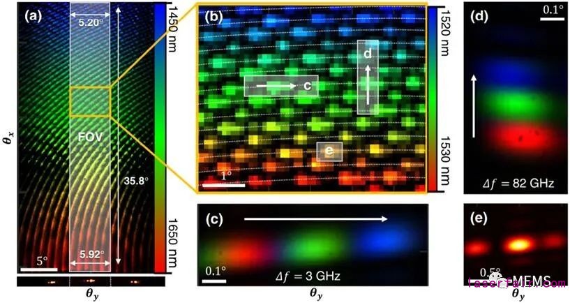 用單個(ge) SOPA瓦片演示2D波長操縱效果。(a)200 nm掃描的遠場拍攝圖像,從(cong) 16500個(ge) 樣本中隻取樣到1500個(ge) 點。光柵瓣極限視場角為(wei) 35.8° x 5.5°。為(wei) 獲得可見度,采用掃描欠采樣(取樣率約10%)和飽和過度曝光的後處理,導致對角線曲線非實際掃描軌跡,曲率由群速度色散導致。底部顯示了1550 nm處的光斑圖,以顯示光柵波瓣受限的視場。(b)A 5° × 5.5°全掃描的分段,隻有70個(ge) 樣本。真實的掃描軌跡用虛線表示以引導人眼觀察,對顏色進行重新編碼以適應較窄的帶寬。(c)快軸波長掃描,三個(ge) 不相鄰的點間距為(wei) 3 GHz。(d)慢軸波長掃描,三個(ge) 不相鄰的點間距為(wei) 82 GHz。(e)1550 nm處的單波長光斑。