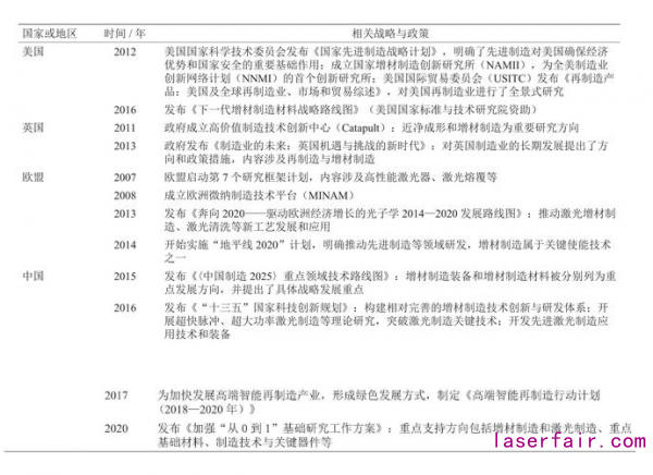 表 1 世界主要國家或地區激光再製造技術及產(chan) 業(ye) 相關(guan) 戰略與(yu) 政策