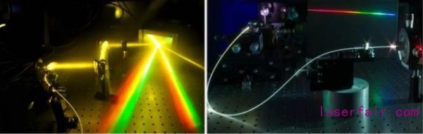 兩(liang) 人發現綠激光的高強皮秒脈衝(chong) 和特殊晶體(ti) 或玻璃相互作用時會(hui) 被顯著展寬,由此觀察到白光的產(chan) 生。隨後,研究人員使用液體(ti) 和氣體(ti) 也產(chan) 生了超連續光,並進入紅外範圍。