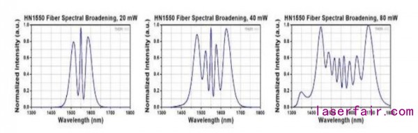 盡管實驗裝置簡單,但是超連續產(chan) 生的物理過程非常複雜。一般而言,激光功率越高,誘導的材料非線性極化越強,超連續譜的帶寬越大,所以皮秒和飛秒激光因為(wei) 具有高峰值功率常被用作種子源。下麵三圖比較了不同功率的飛秒激光通過Thorlabs高非線性光纖展寬的模擬結果。因為(wei) 高非線性光纖的模場較小,所以熔接過程更為(wei) 複雜,Thorlabs提供專(zhuan) 業(ye) 光纖熔接服務,如有此類需求歡迎聯係我們(men) 。