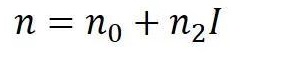 另外,超短光脈衝(chong) 由於(yu) 高峰值功率可使材料的折射率產(chan) 生微小變化,變化量和強度相關(guan) 。材料折射率的非線性變化反過來使光脈衝(chong) 的振蕩模式產(chan) 生相位差,這個(ge) 過程叫做自相位調製。光強相關(guan) 的折射率用下式表示,其中n2為(wei) 非線性係數。