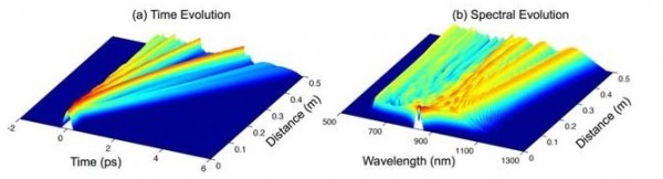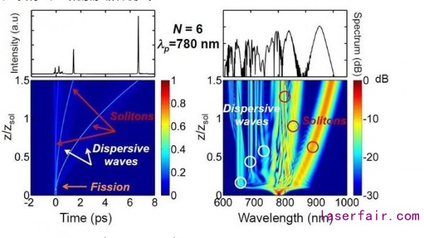 對於(yu) 每個(ge) 新形成的孤子,高階色散使能量向短波長傳(chuan) 遞,非彈性光散射效應使光譜連續向長波長頻移。完全理解這兩(liang) 個(ge) 過程中的數學細節非常複雜,但通過模擬可形象地展示脈衝(chong) 在時域和頻域的演變過程。