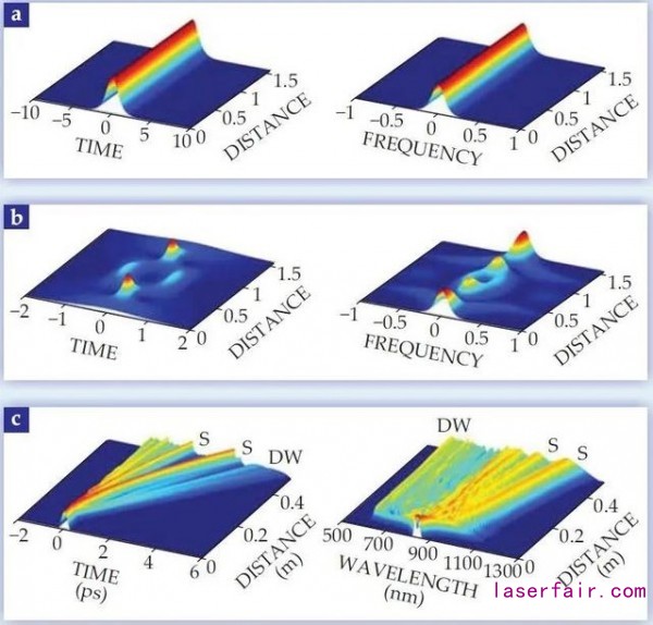 b. 高強度脈衝(chong) 在時域和頻域形成周期性高階孤子:某個(ge) 時間和位置出現一個(ge) 波峰,迅速消失後再次形成。