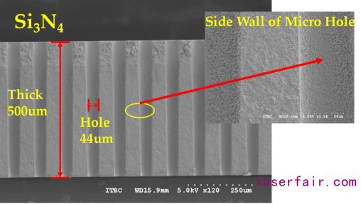 圖6為(wei) 垂直式探針卡導向板的上蓋(UD)和下蓋(LD)。探針導向板微孔參數分別由芯片設計的測試點設置、所用的探針直徑而定,一般而言,加工孔徑20-200μm,孔間距40-200μm,厚度0.1-1mm,孔型孔壁要求垂直,位置精度高。導向板材質多為(wei) 陶瓷和氮化矽(Si3N4),氮化矽被越來越多的應用於(yu) 新一代探針卡,但氮化矽極高的硬度使得它無法像傳(chuan) 統可加工陶瓷一樣采用機械加工,而常規的激光打孔方式也無法滿足要求。
