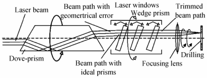 圖4為(wei) 道威棱鏡掃描係統光路圖,道威棱鏡安裝到一個(ge) 高速旋轉的空心力矩電機上,棱鏡旋轉一次可使激光旋轉掃描兩(liang) 次。準直後的激光東(dong) 經過前端的角度偏轉和橫向平移後進入道威棱鏡和調整光楔,最後通過聚焦鏡聚焦到工作平麵,實現環切掃描鑽孔。三個(ge) 光楔通過偏擺和旋轉補償(chang) 道威棱鏡的加工、裝配誤差,這種裝置可實現光斑2倍於(yu) 轉速的自轉,避免了光斑質量對孔質量的影響,但對道威棱鏡的加工準確度和裝配準確度要求很高,後續的三光楔補償(chang) 調整結構也相對複雜,對於(yu) 批量生產(chan) 的工程應用具有一定的局限性。