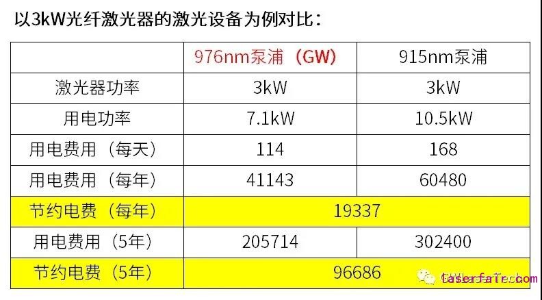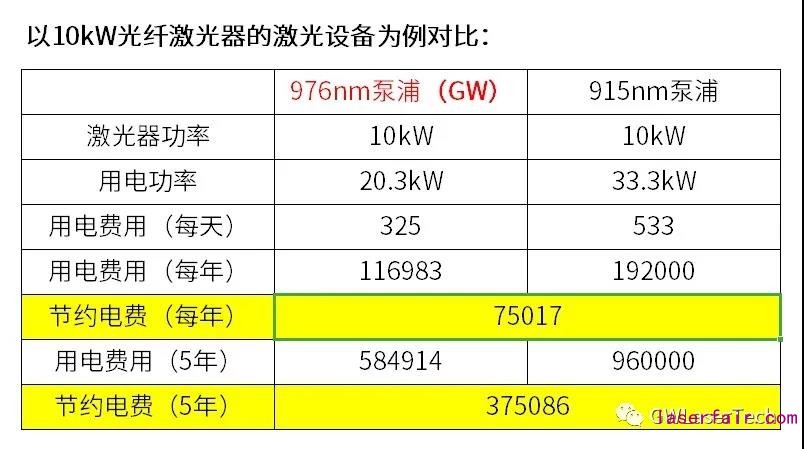 從(cong) 客戶使用角度分析,當用戶配置使用3kW以上高功率光纖激光器時,若采用更高電光轉化效率的產(chan) 品,以裝備3kW光纖激光器的激光設備為(wei) 例,采用更高效率的976nm泵浦技術,光纖激光器的用電費用年將節省約2萬(wan) 元,整個(ge) 壽命周期內(nei) 將節約用電費用約10萬(wan) 元。