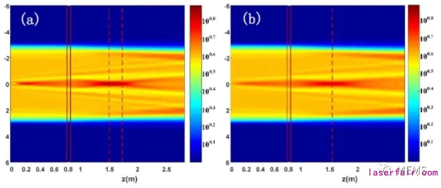 圖2 橫向光場隨軸向的傳(chuan) 輸演變(a)超高斯缺陷,(b)高斯缺陷。紅色虛線代表熱像麵位置