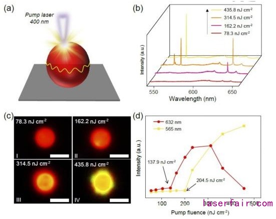 圖1 智能響應的微激光器供、受激光隨泵浦能量的競爭(zheng) (a)單個(ge) 微球在400nm泵浦下的激光機製示意圖;(b)單個(ge) 微球在不同泵浦能量下的光譜圖;(c)相對應的不同泵浦能量下單個(ge) 微球的實況圖;(d)單個(ge) 微球在不同泵浦能量下激光能量示意圖。