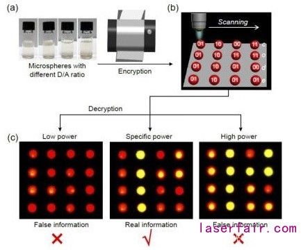 圖2 智能響應的微型激光的光加密陣列(a)含有不同供、受體(ti) 比例組合的微球作為(wei) 有機打印的編碼打印原料;(b)激光矩陣的光加密陣列示意圖;(c)通過受激每個(ge) 微球受激狀態破譯編碼信息。