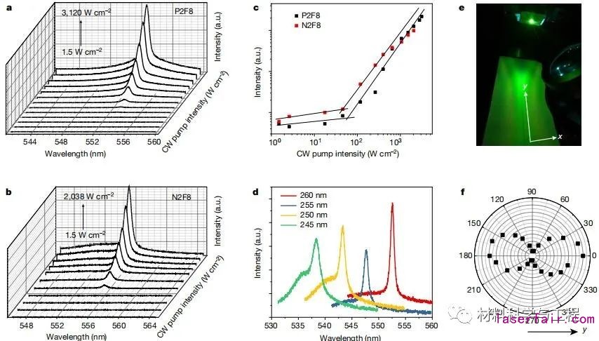 圖3.P2F8和N2F8鈣鈦礦膜的連續激光發射特性。(a,b)在不同功率的連續波激發下發射光譜的演變;(c)激光強度隨C W泵強度的變化而變化;(d)激光峰值波長與(yu) 光柵周期的關(guan) 係;(e)CW激光遠場圖案的照片;(f)CW激光的偏振特性。