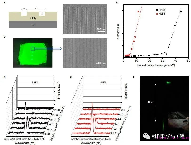 圖2.P2F8和N2F8鈣鈦礦膜的DFB腔和脈衝(chong) 激光特性。(a)空氣溝槽寬度w =120 nm,光柵周期Λ=250 nm和光柵高度h=60 nm 的DFB腔的圖案設計(左)和頂SEM圖像(右);(b)在紫外線燈和在DFB襯底上旋塗的P2F8膜的SEM圖像,鈣鈦礦層的厚度為(wei) 90nm;(c)激光強度作為(wei) 脈衝(chong) 能量的函數;(d,e)在P2F8(d)和N2F8(e)閾值附近,脈衝(chong) 激發下發射光譜的演化;(f)P2F8薄膜激光光束的遠場模式。
