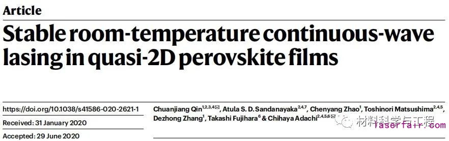 近日,中國科學院長春應用化學研究所秦川江研究員和日本九州大學Chihaya Adachi教授領導的研究團隊(共同通訊作者)研究了具有不同有機陽離子的基於(yu) 鹵化鉛的準2D鈣鈦礦薄膜,而且在放大自發發射、光泵浦脈衝(chong) 以及連續激光中觀察到長壽命的三重態激子顯著地阻礙了粒子數反轉。研究結果表明,單線態三重態激子湮沒是導致激光死亡的一種可能的內(nei) 在機製。通過使用具有高質量因子的分布式反饋腔,並應用三重態管理策略,可以在室溫下在空氣中連續光泵浦下獲得穩定的準2D鈣鈦礦綠色準激光器。相關(guan) 研究成果以“Stableroom-temperature continuous-wave lasing in quasi-2D perovskite films”為(wei) 題於(yu) 2020年9月2日在線發表在Nature上。