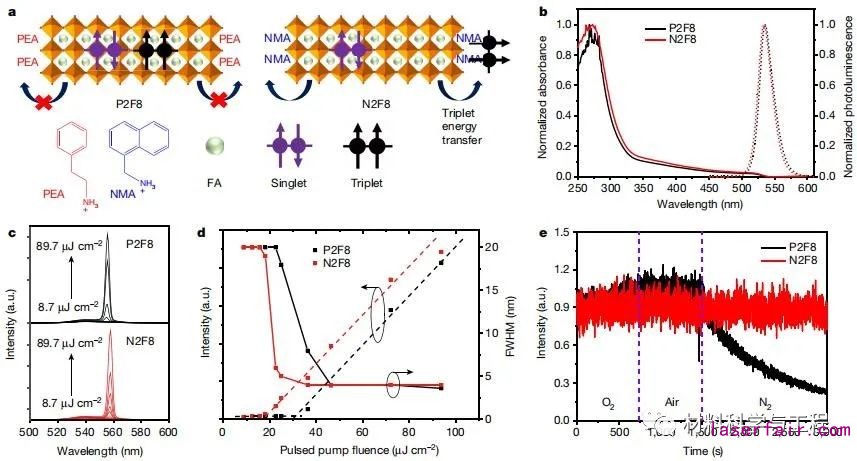 為(wei) 了表明由三重態激子引起的STA對準-2D鈣鈦礦中的反轉是有害的,作者研究了基於(yu) FAPbBr3的準2D鈣鈦礦,其具有兩(liang) 種不同的有機陽離子,即苯乙基溴化胺(PEABr)和1-萘甲基溴化銨(NMABr)。基於(yu) PEABr的鈣鈦礦(P2F8)摻入具有高三重態能量的有機陽離子,而基於(yu) NMABr的鈣鈦礦(N2F8)包含具有低三重態能量的有機陽離子。P2F8和N2F8具有類似的分子大小,導致準二維鈣鈦礦具有相當的結晶度和光物理特性。