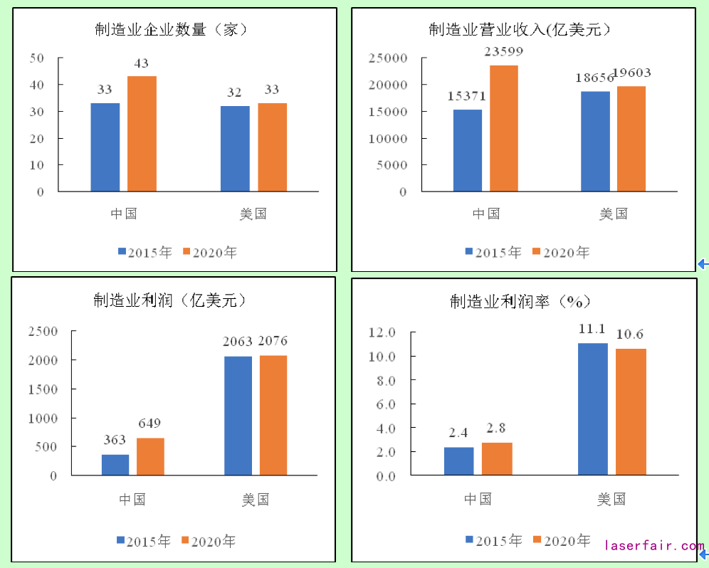 在利潤總額方麵,我國製造業(ye) 上榜企業(ye) 利潤總額增加282億(yi) 美元,年均增長15.76%;而同期美國企業(ye) 利潤總額增長13億(yi) 美元,年均增速僅(jin) 為(wei) 0.13%。在利潤率變化方麵,美國製造業(ye) 上榜企業(ye) 利潤率由2015年的11.1%降至2020年的10.6%;而同期我國上榜企業(ye) 利潤率由2.4%上升到2.8%。