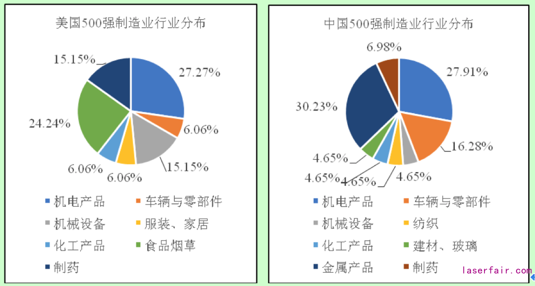 從(cong) 產(chan) 業(ye) 結構看,美國上榜製造業(ye) 多集中在機電產(chan) 品、機械設備、製藥以及食品煙草等行業(ye) ;我國則主要集中在金屬產(chan) 品、機電產(chan) 品、車輛與(yu) 零部件等行業(ye) 。