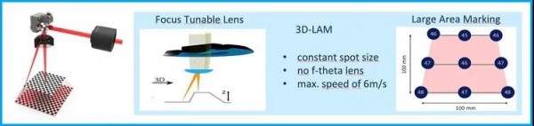 由於(yu) 緊湊的外形,EL-10-42-OF結合標準f-theta鏡頭提供了大z範圍,可靈活調整工作距離。例如,使用f=160毫米f-theta鏡頭,z範圍達到100毫米,如下圖所示。由於(yu) 場平坦化是通過f-theta透鏡實現的,因此EL-10-42-of的集成是一個(ge) 快速、簡單的過程。通過來自控製器卡的模擬信號,EL-E-OF-A驅動電子板精確地沿著z軸控製EL-10-42-OF,允許在z軸的大變化之間高速跳躍。