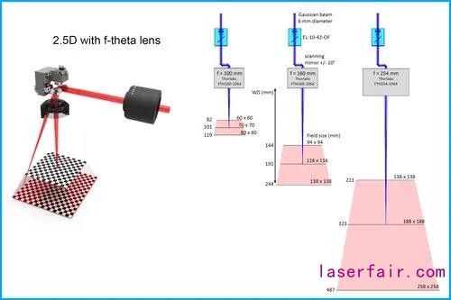 當集成無f-theta透鏡的EL-10-42-OF時,附加的固定光學元件與(yu) 可調諧透鏡結合使用,將激光束聚焦到加工表麵上。然後,EL-10-42-OF控製z軸以進行場平坦化以及z軸,從(cong) 而提供真正的三維處理。這種結構的優(you) 點是掃描場更大,光學質量(光斑尺寸更小)比可比的2D係統好。以下兩(liang) 種參考設計的最大工作距離相似,比較顯示無f-theta透鏡時掃描量更大。