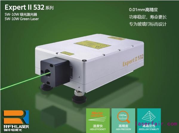 在玻璃上打標LOGO、刻字,瑞豐(feng) 恒推薦Expert Ⅱ 532係列水冷式綠光半導體(ti) 泵浦脈衝(chong) 固體(ti) 激光器(功率範圍5W至10W)。Expert Ⅱ 532 綠光激光器重複頻率覆蓋範圍寬,單脈衝(chong) 至200kHz;在所有頻率範圍內(nei) 都嚴(yan) 格保證擁有優(you) 越的光束質量(M2<1.3)和完美光斑特性(光斑橢圓度>90 %),非常適合超精細打標;另外,綠光激光器的脈衝(chong) 寬度<35ns@30k,加工時熱影響區域很小,不會(hui) 出現燒焦、變形的情況; 而獨特的調Q控製技術,適合各種激光應用控製需求;采用全數字智能電源控製技術,操作簡單、方便遠程監控。