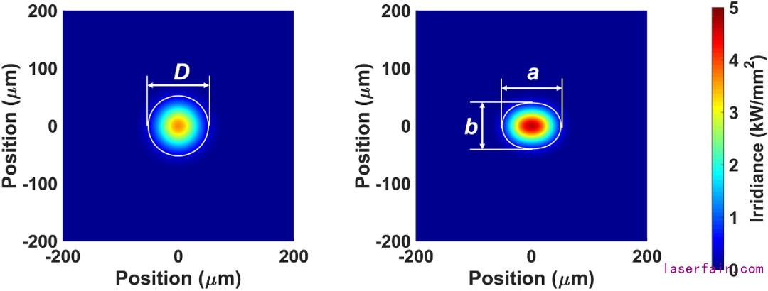 圖2單高斯束圓形和雙高斯束耦合橢圓激光光斑截麵能量分布圖