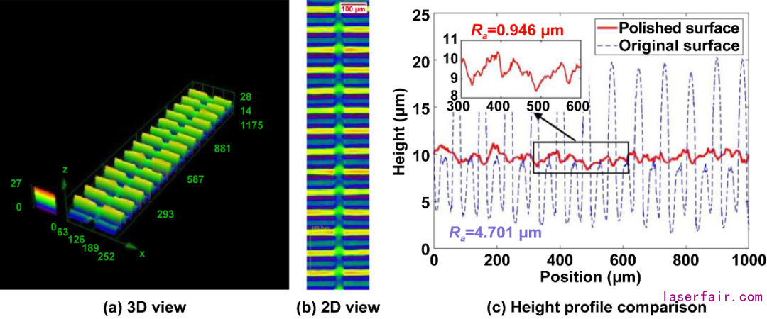 對比單激光,雙激光的優(you) 勢在於(yu) 在低激光功率(12W)時,其粗糙度降低比例峰值(80%)明顯高於(yu) 單激光(65%)。增大了激光束斑的可用尺寸範圍。而當激光功率超過15W時,高功率使激光的能量密度分布優(you) 化影響大大降低,使得單雙激光的拋光效果差異不大,甚至由於(yu) 存在雙熱點問題,在22W功率下,雙激光拋光效果略遜於(yu) 單激光。作者認為(wei) ,在12W時,雙激光方式的粗糙度降低比例提高應歸因於(yu) 長的熔池。因此,作者對材料表麵形貌特征進行快速傅裏葉變換(FFT),發現在85μm和40μm空間波長處有兩(liang) 個(ge) 明顯的峰值。之後,作者追蹤這兩(liang) 個(ge) 特征空間波長拋光前後的峰值以對拋光效果進一步量化。結果證明在40μm波長處,單雙激光拋光前後峰值相似,但在85μm波長處,雙激光拋光有更大的峰值差,這證明雙激光拋光有更長的熔池使得間距為(wei) 85μm的粗糙表麵的材料得以熔化並重新分布。通過仿真軟件得到的熔池長度結果與(yu) 實驗數據很好地吻合,再次證明了機理解釋的合理性。