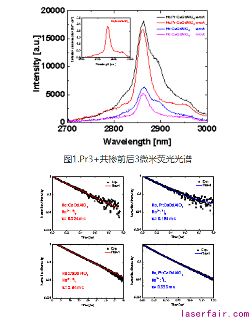 研究團隊采用提拉法生長Ho:CaGdAlO4和Ho,Pr:CaGdAlO4晶體(ti) ,分析晶體(ti) 質量、結構、溶質分凝與(yu) 偏振光譜性能。Ho3+:5I6→5I7躍遷呈寬帶熒光特性,發射波長從(cong) 2750nm延伸至3000nm,為(wei) 中紅外超短脈衝(chong) 的產(chan) 生提供頻譜保障。但激光下能級的壽命(8.64ms)遠大於(yu) 上能級(0.22ms),影響激光效率且易出現激光自終態瓶頸效應。研究發現,共摻雜Pr3+離子對3微米激光下能級(Ho3+:5I7)起有效退激活作用,退激活效率達96.2%。共摻Pr3+離子使Ho,Pr:CaGdAlO4晶體(ti) 中紅外熒光增強。相應的3微米激光實驗正在進行。
