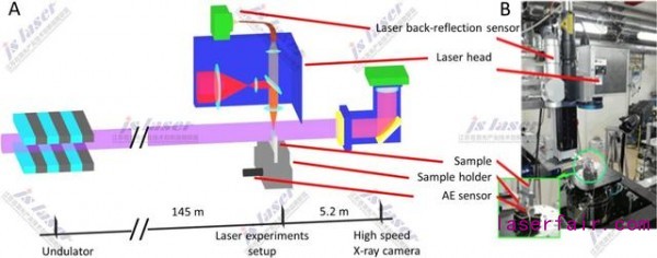 (A)激光焊接時采用原位X射線照相的實驗裝置示意圖,(B) 激光焊接工作站的照片